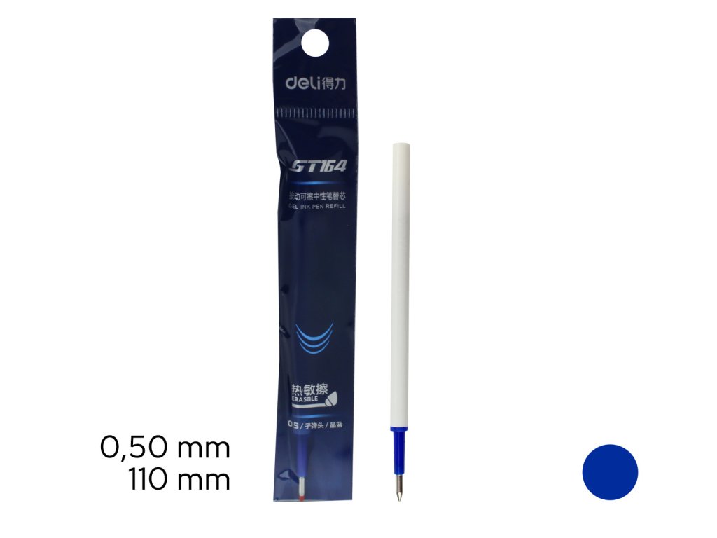 Modrá náplň DELI GT164 0,5 mm do mazacích gelových propisek Deli. Jednoduchá výměna a pokračujete v psaní bez stresu. Tato náplň je ideální pro všechny, kdo si zvykli na pohodlí mazatelného psaní. Chyby už nejsou stres, jen drobná zastávka na cestě dál.