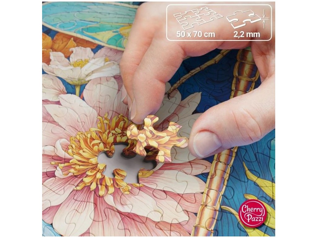 Puzzle Cherry Pazzi jsou vyhlášené svou špičkovou kvalitou zpracování. Dílky jsou vyrobené z nejlepšího puzzle materiálu, mají tloušťku 2,2 mm, luxusní saténový povrch a velmi rozmanité tvary. Každý dílek zapadne přesně tam, kam patří – bez zkoušení a bez frustrace. Stejný důraz na detail má i krabička, která je pevná, elegantní a krásná na pohled. Vyrobeno v EU, s láskou k řemeslu a pohodlí při skládání.
